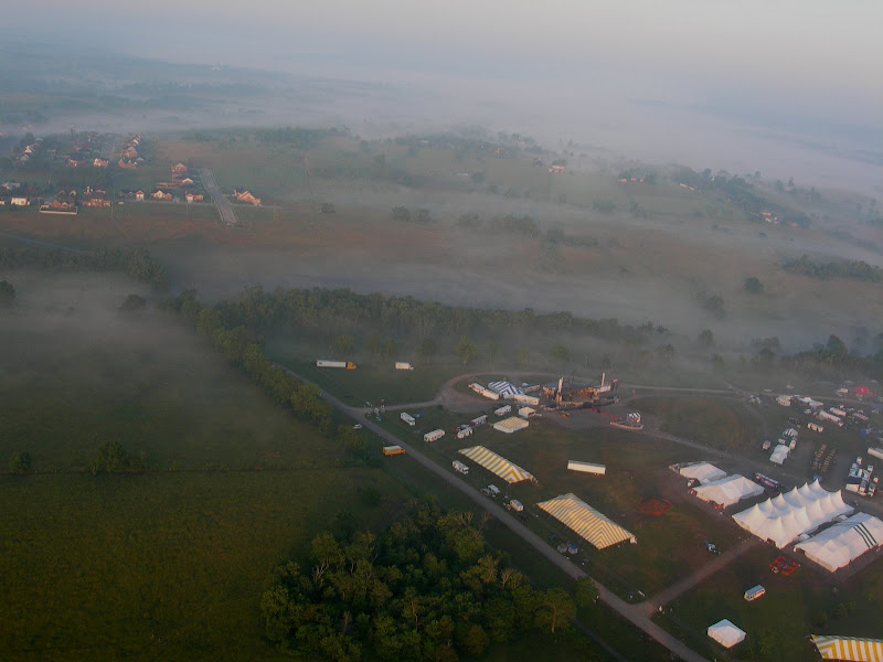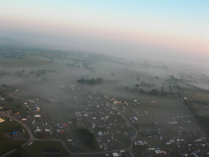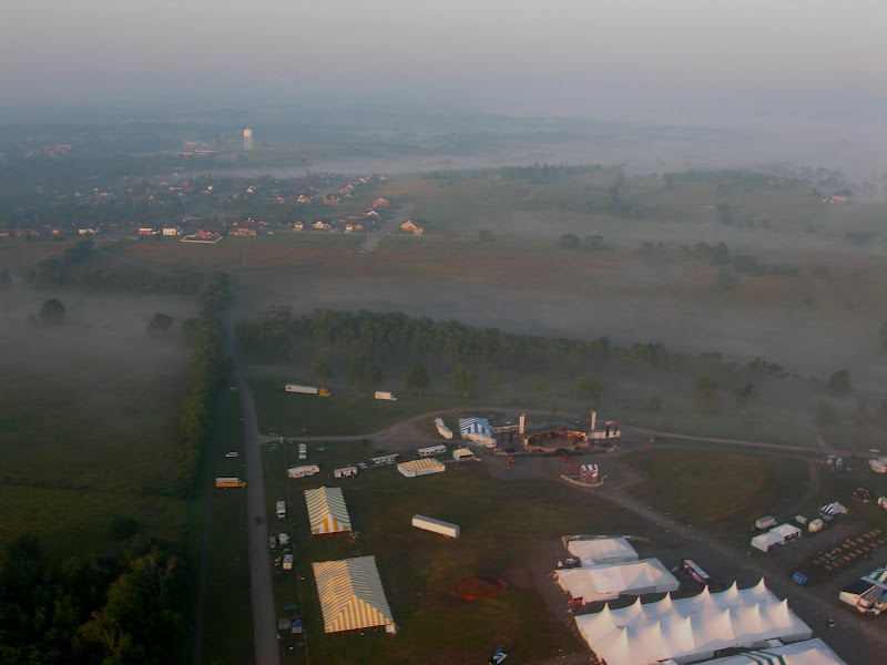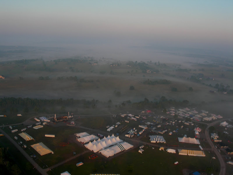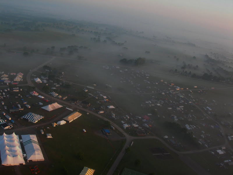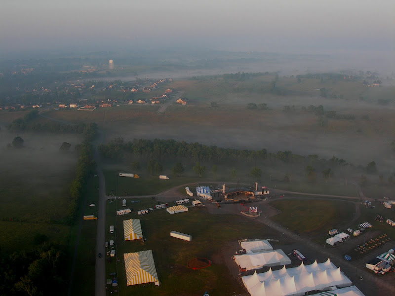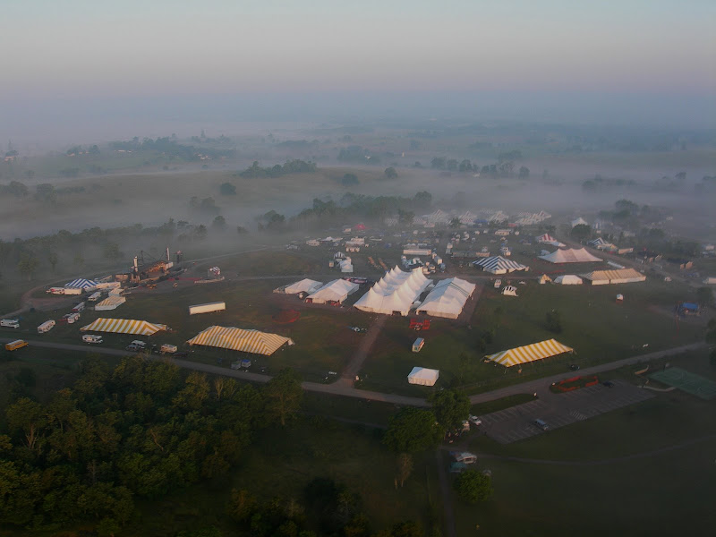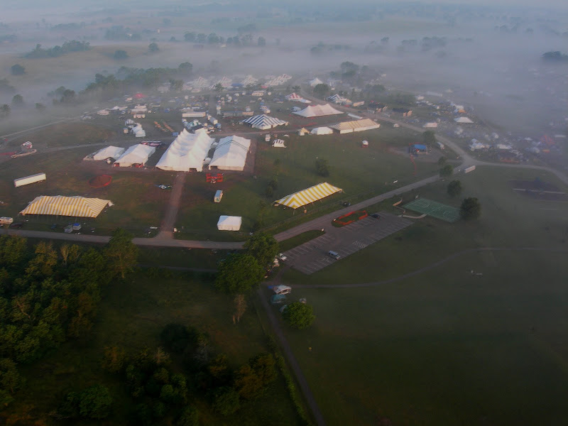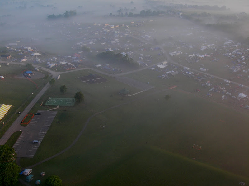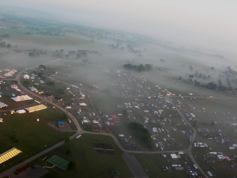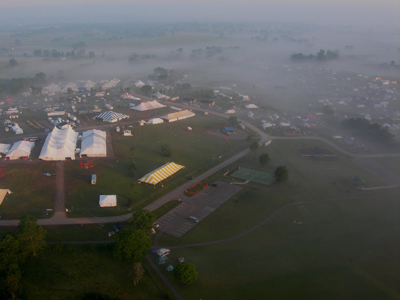 I have been taking photos via my RC airplane for about three years, and this year I decided to bring my plane along to get some shots. It is a small, foam park-flyer that runs off a large electric battery, so it is light-weight and safe. I atttach a regular digital camera (Nikon Coolpix 7900) and strap the shutter down in sports spectator mode so that it takes non-stop while I fly the plane. Conditions this year were a bit too windy for my plane to handle but I was able to get some decent shots, regardless. Sunday morning brought foggy conditions which are my favorite for aerial photos.