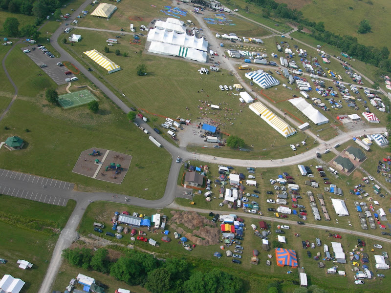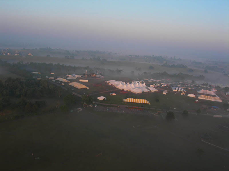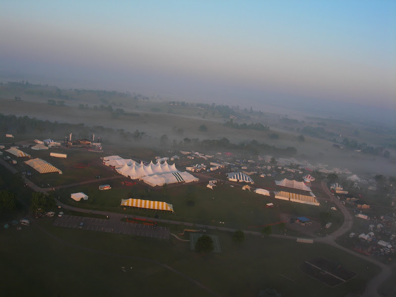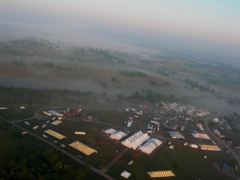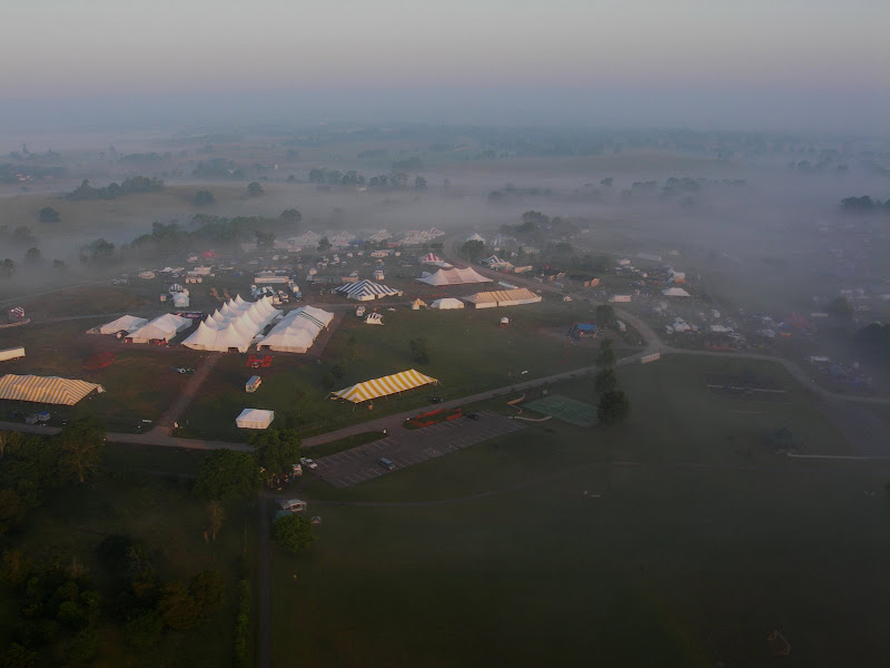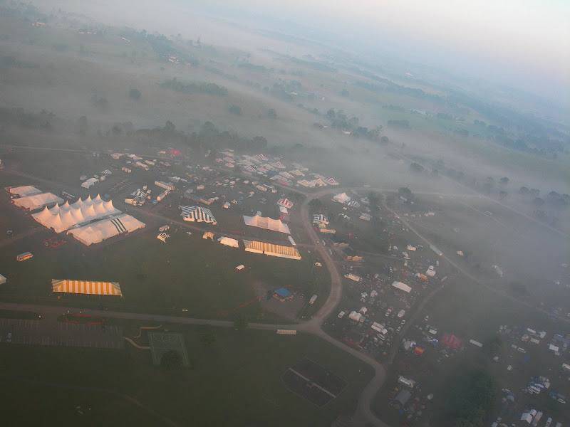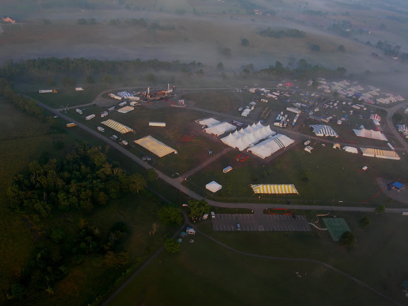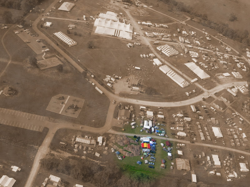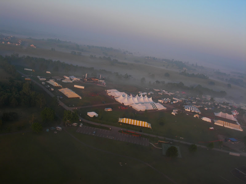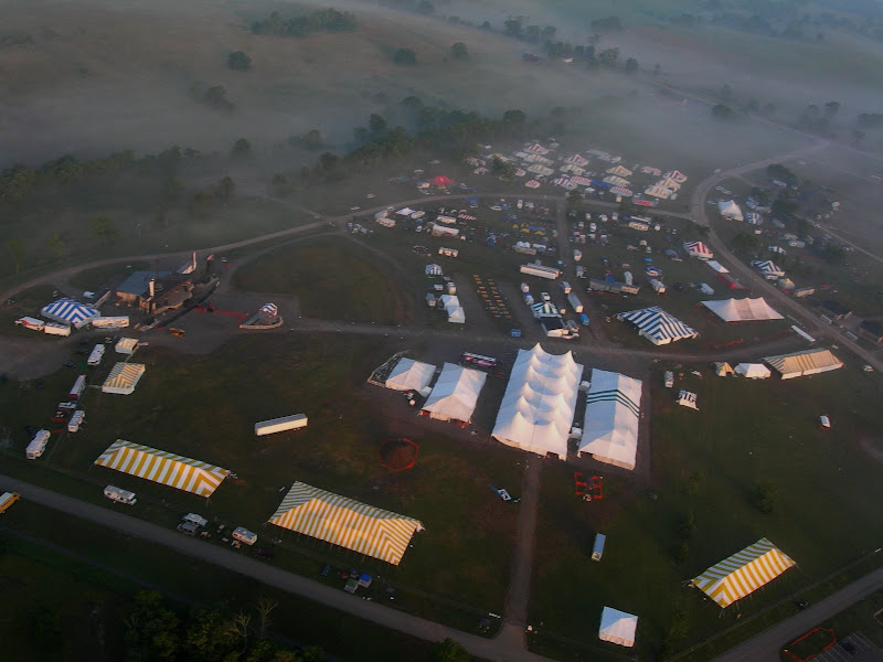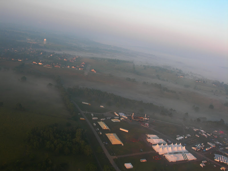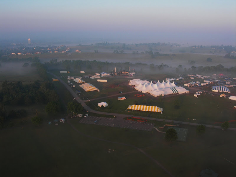 I have been taking photos via my RC airplane for about three years, and this year I decided to bring my plane along to get some shots. It is a small, foam park-flyer that runs off a large electric battery, so it is light-weight and safe. I atttach a regular digital camera (Nikon Coolpix 7900) and strap the shutter down in sports spectator mode so that it takes non-stop while I fly the plane. Conditions this year were a bit too windy for my plane to handle but I was able to get some decent shots, regardless. Sunday morning brought foggy conditions which are my favorite for aerial photos.